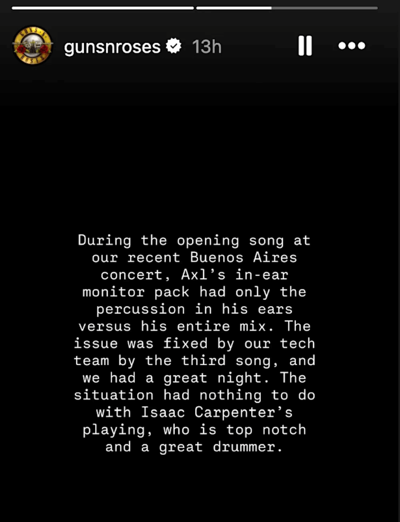 “O retorno do Axl só trazia a percussão, sem o restante da mix. Nossa equipe corrigiu tudo na terceira música. E seguimos com um ótimo show. Isaac é um baterista incrível.”