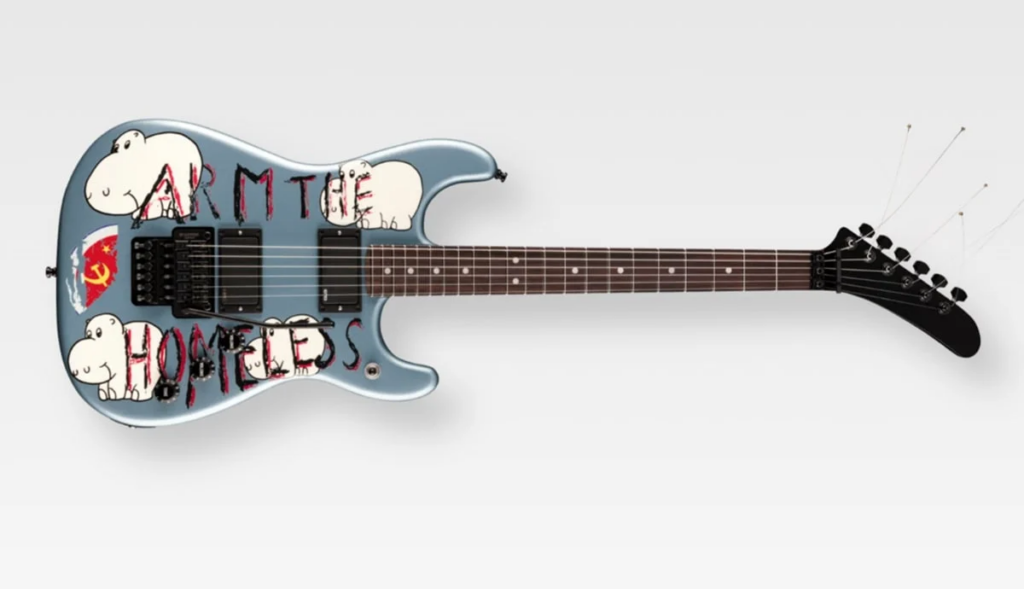 Com acabamento Blue Ice Metallic, o slogan “Arm the Homeless”, desenhos feitos pelo próprio músico e o icônico headstock em formato de taco de hóquei, o modelo carrega não só história, mas também uma mensagem política clara.