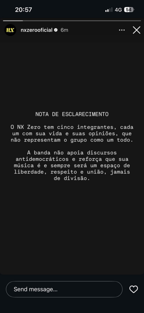 O NX Zero se manifestou nas redes sociais para esclarecer sua posição após uma polêmica envolvendo discurso antidemocrático. A banda publicou uma nota oficial reforçando que não endossa esse tipo de posicionamento.